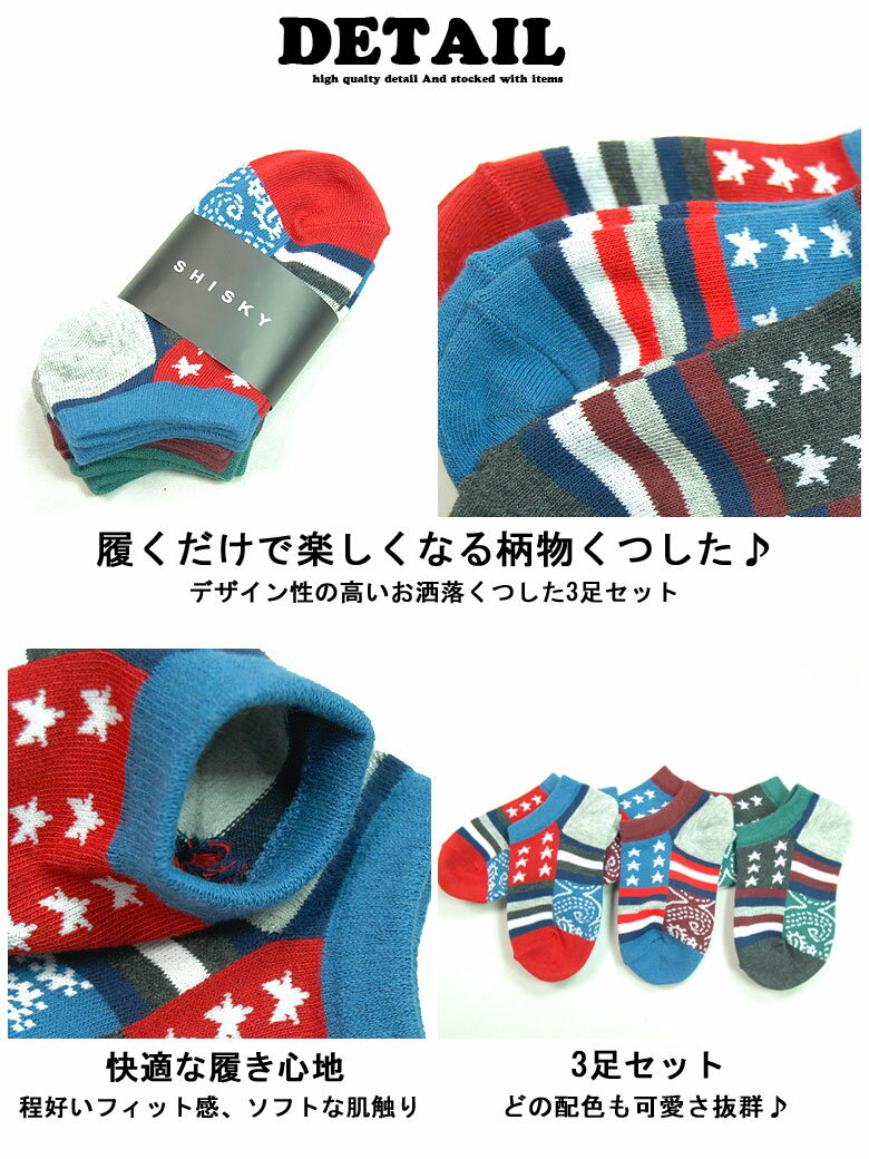 ITEM SPEC 商品名 「946-13」 キッズ ボーイズ 3足セット アメリカン柄 くつした 商品番号 201610064 サイズ 15cm〜17cm / 18cm〜20cm / 21cm〜23cm 素材・仕様 綿85% ポリエステル10% ポリウレタン5% 生産国 中国製 おすすめ ポイント 3足セットでお得感たっぷり♪