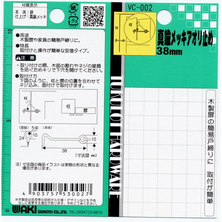 真鍮メッキアオリ止めVC-002 38mm【WAKI 建築金物 建築金具 ドア用金物 フック・吊金具】