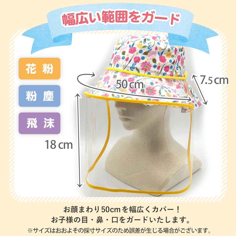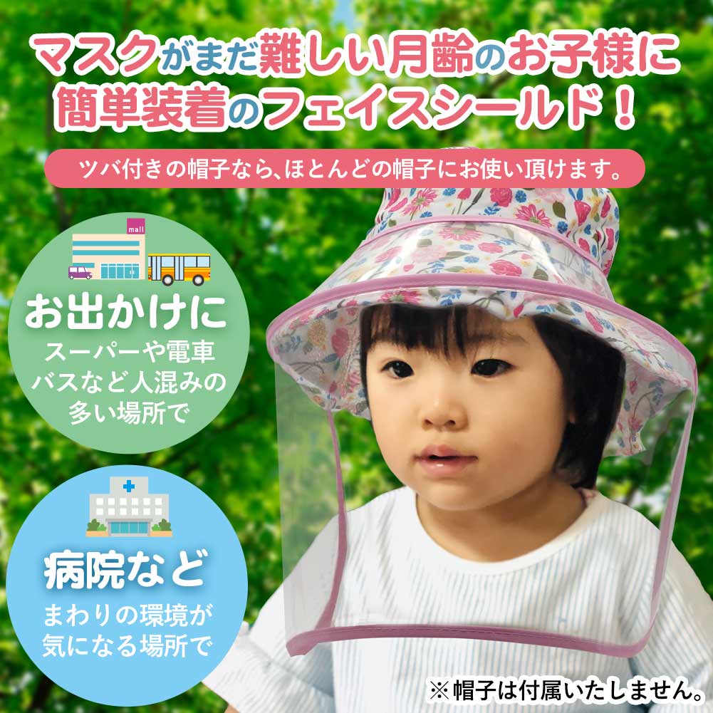 マスクを嫌がるお子様に最適! 広い透明フェイスシールドは、花粉・粉塵・細菌・ウイルスを含む飛沫を防止、 インフルエンザ流行時期に最適です! お手持ちのツバ付き帽子に被せて後ろで留めるだけの簡単仕様です。