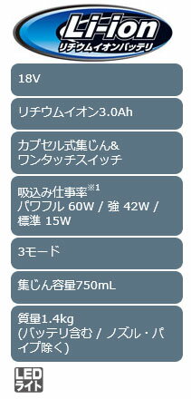 標準付属品:ノズル・ストレートパイプ・サッシ(すきま)ノズル・高機能フィルタEX・リチウムイオンバッテリ(BL1830B)・充電器(DC18RF)